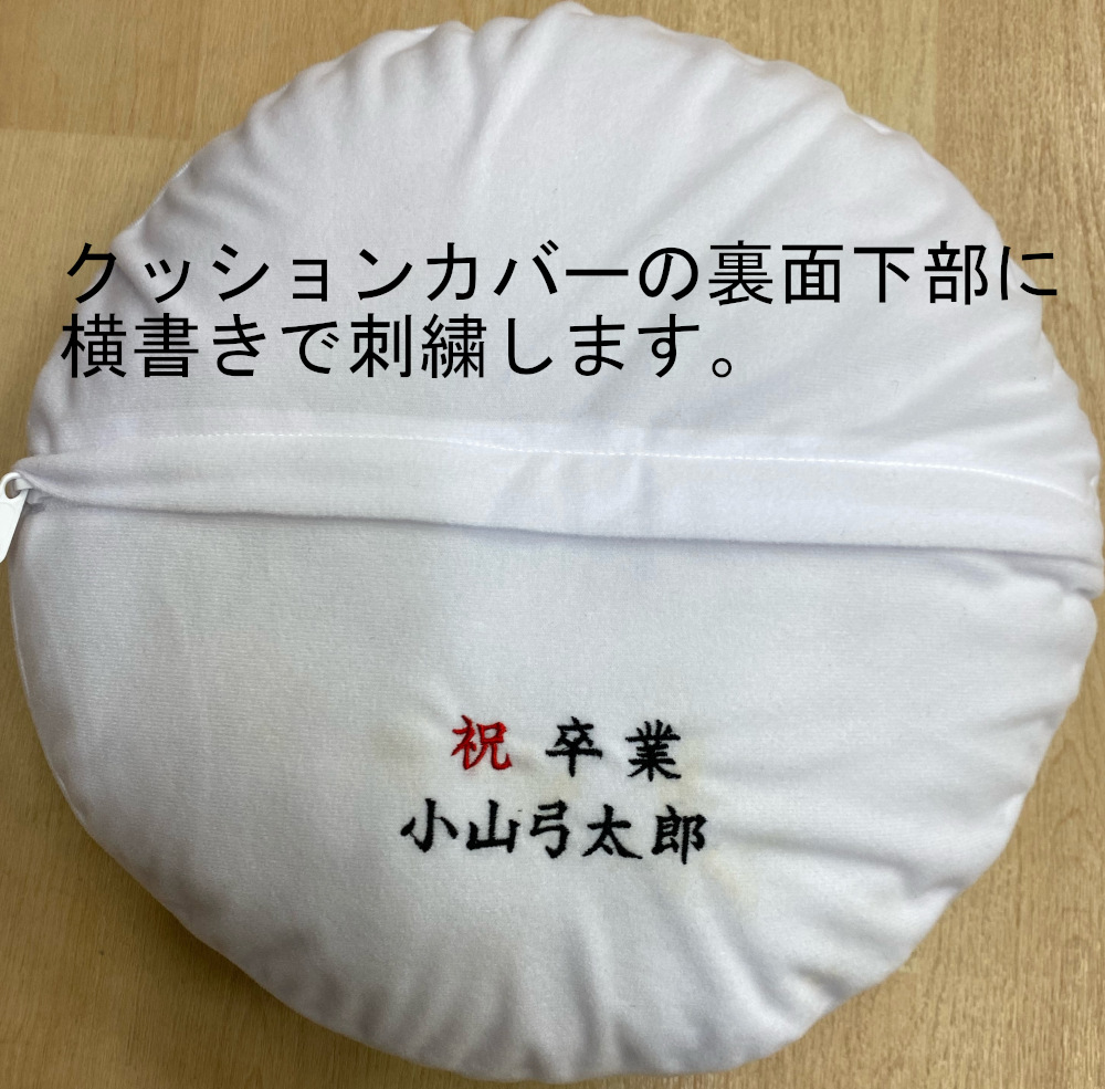 的クッションのカバー裏面にお名前や好きな言葉などを横書きで刺繍します(納期約10日間)。刺繍糸は全8色の中から2色までお選びいただけます。