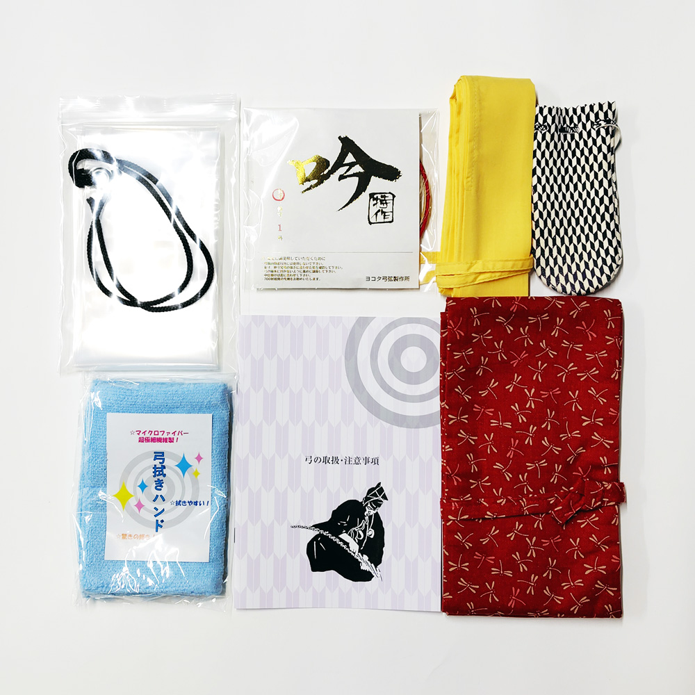 付属品:弦1本(吟 特作、六寸伸は天弓弦翠)、右近弓袋(黄)、柄弓巻、鹿革石突、雨袋、弓拭きハンド / 弓保証:あり(1年間)